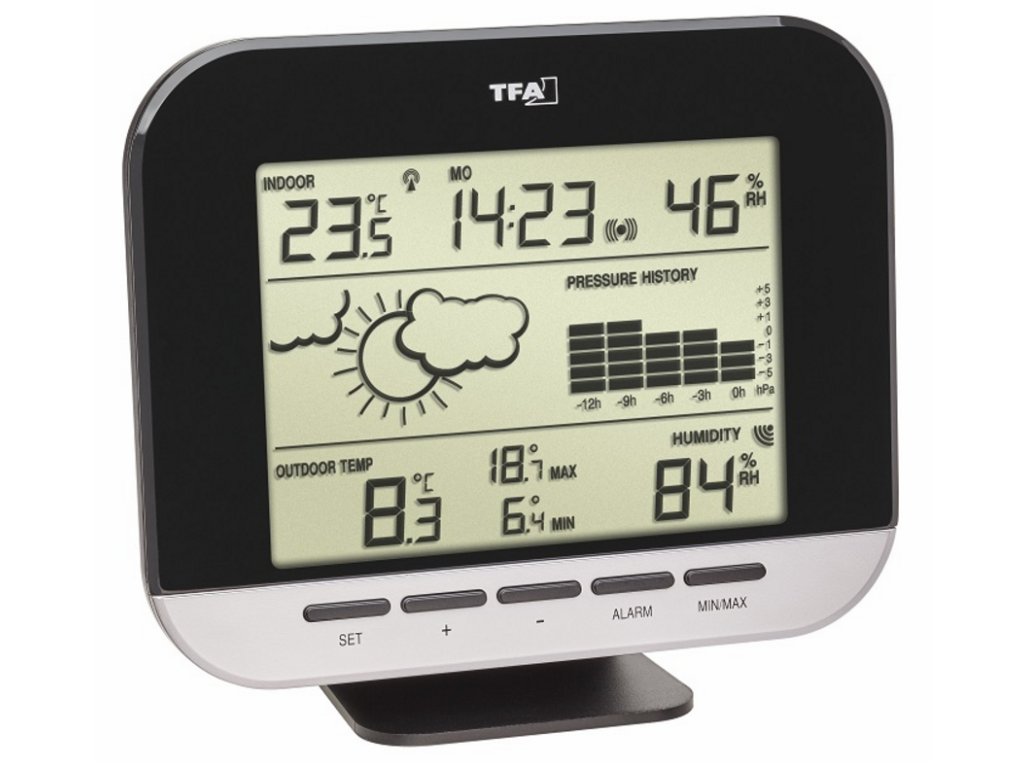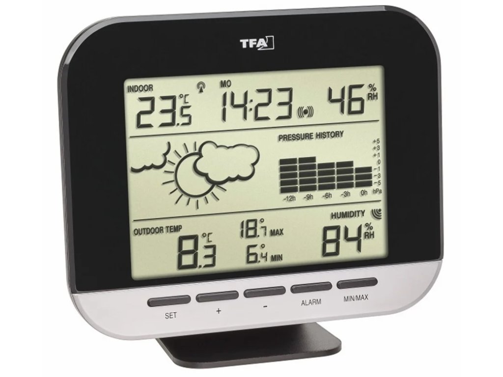 Bezdrôtová meteorologická stanica, ktorá meria teplotu a vlhkost v interiéri aj exteriéri. Stanica má funkciu zaznamenávania minimálnych a maximálnych hodnôt teploty s časom a dátumom záznamu, predpovede počasia, tendenciu atmosférického tlaku a grafického vývoja tlaku za posledných 12 hodín. Veľkou výhodou je aj budík a rádiom riadený čas s dátumom. Meteostanica je kompatibilná s modulárnym monitorovacím systémom WeatherHub (môže odosielať údaje o vnútornej a vonkajšej teplote/vlhkosti do systému WeatherHub). Vlastnosti a funkcie Predpoveď počasia Vývoj atmosférického tlaku Stĺpcový graf vývoja tlaku za posledných 12 hodín Rádiom riadený čas a dátum Budík Možnosť pripojenia k monitorovaciemu systému WeatherHub Technické špecifikácie Rozsah merania teploty: vnútorná teplota 10 °C...+60 °C, vonkajšia teplota: -40 ...+60 ...95%, vonkajšia vlhkosť: 1 ... 99% Základňa Rozmery základne: 160 x 36 (56) x 130 (145) mm Hmotnosť: 260 g Napájanie: 2 x 1,5 VC batérie (nie sú súčasťou dodávky) Stanicu možno postaviť alebo zavesiť4. 2x 1,5 V batérie AA (nie sú súčasťou dodávky) Dosah snímača: 100 m (v otvorenom priestore) Snímač možno postaviť alebo zavesiťDodatočné parametre