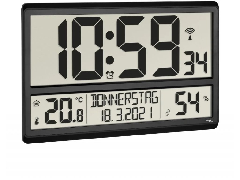 Nástenné hodiny TFA 60.4520.01 sú vhodné do každej kancelárie, čakárne, recepcie alebo iných väčších priestorov. Veľký a veľmi prehľadný displej je ľahko čitateľný aj z väčšej vzdialenosti. Sledovať čas pomáha aj zobrazenie názvu dňa v týždni (na výber z 8 svetových jazykov) a plne zobrazené dátum. Presný rádiom riadený čas sa zobrazuje veľmi veľkými číslicami a vďaka signálu DCF hodiny umožňujú aj automatické nastavenie letného a zimného času. Hodiny zobrazujú aj nameranú teplotu a vlhkost vzduchu na kontrolu vnútornej klímy. Jednoduchý a čistý dizajn sa hodí do každého prostredia a hodiny je možné zavesiť na stenu alebo umiestniť na podložku. Okrem toho majú tieto hodiny budík s funkciou opakovaného buzení. Funkcie: - budík s funkciou buzení, - budík s funkciou buzení as funkciou buzení: Prehľadný XL displej Vysoko presný čas riadený DCF Zobrazenie vnútornej teploty a vlhkosti funkciou opakovaného budenia Nastaviteľné časové pásmo Technické informácie: Rozsah merania vnútornej teploty: -10 °C až +50 °C Rozsah merania vnútornej vlhkosti: 1 % až 99 % relatívnej vlhkosti Materiál: plast Napájanie: 4 x 1,5 V AA (nie je súčasťou dodávky) Rozmery: 360 x 28 (84) Na postavenie alebo zavesenieDodatočné parametre