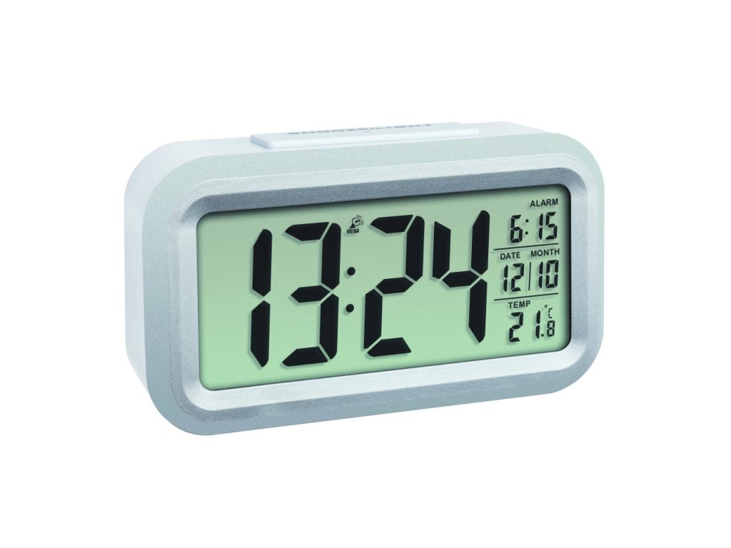 Digitálny budík s veľkou LCD obrazovkou as funkciou zobrazenia dátumu a vnútornej teploty. Funkcie a vlastnosti: Rádiom riadený čas a dátum Budík s funkciou opakovaného budenia (Snooze) Zosilňujúce a zrýchľujúce zvonenie budenia Možnosť podsvietenia displeja (5 sekúnd) Funkcia merania vnútornej teploty Nastavenie zobrazenia formátu času (12h/24h) Funkcia svetelného senzora, ktorý aktivuje podsvietenie displeja v závislosti na intenzite osvetlenia. Ovládací panel na zadnej strane budíka Prepínanie jednotiek merania teploty ° C / ° F Technické informácie: Rozmery: 138 x 48 x 79 mm Rozsah merania teploty: -9 ° C... + 50 ° C Hmotnosť: 147 g Napájanie: Batérie 3 x 1,5 V AAA (nie sú súčasťou balenia) Farba: bielaDodatočné parametre