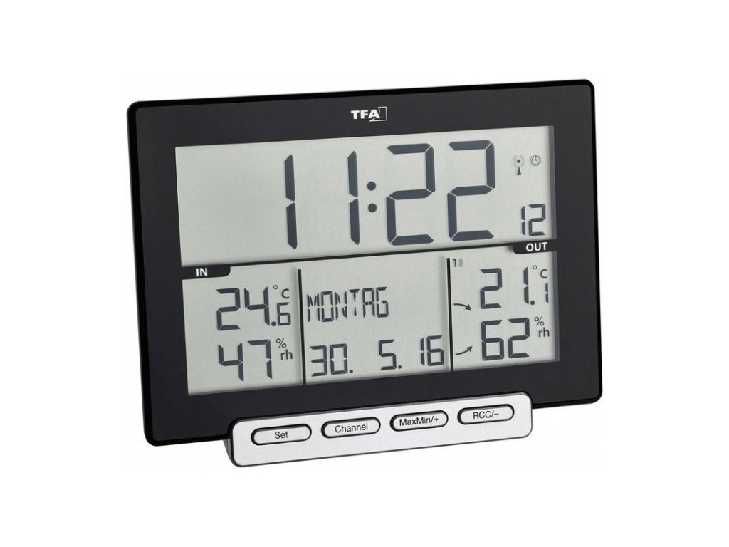 Pre tých, ktorí potrebujú monitorovať teplotu na viacerých miestach, je ideálne zariadenie TFA 30.3058.01 TRINITY. Vďaka bezdrôtovému signálu (dosah až 80 mv otvorených priestoroch) prijíma údaje o teplote a vlhkosti zo snímača základňa s displejom, ktorá má tiež zabudovaný snímač teploty a vlhkosti. V hornom riadku displeja sa veľkým písmom zobrazuje čas kontrolovaný signálom DCF. V spodnom riadku uprostred sa zobrazuje dátum a deň v týždni slovne (nemecky, anglicky, italsky, francúzsky, španielsky, holandsky). Jeden bezdrôtový snímač (TFA 30.3221.02) je už súčasťou zariadenia, ďalšie 2 snímače je možné pridat'. Prístroj má naďalej funkcie, ako je pamäť pre minimálne/maximálne namerané hodnoty, indikácia trendov teploty/vlhkosti (klesajúca, stúpajúca, nemeniaca sa). Prijímacia časť (základňa s displejom) je kompletne vybavená stojanom, a tak ponúka možnosť umiestnenia teplomera na stôl, ako aj montáž na stenu. Vysielací snímač je možné zavesiť alebo postaviť. Umiestnenie vysílača môže byť vzdialené až 80 m od prijímača. Vlastnosti: Meranie vnútornej a vonkajšej teploty/vlhkosti komunikuje až s 3 bezdrôtovými snímačmi (jeden je súčasťou dodávky) Čas zobrazený veľkým písmom displej zobrazuje aj dátum a deň v týždni (6 jazykov) pamäť pre minimálne/maximálne hodnoty indikácia trendu teploty/vlhkosti indikácia slabej batérie 12/24 hodinového formátu hodín Technické informácie Základňa: Rozsah merania teploty: 0 °C až +50 °C s rozlišením 0,1 °C presnosť merania teploty: +/- 1 °C rozsah merania vlhkosti: 10 % až 99 % s rozlišením 1 % Presnosť merania vlhkosti: +/- 5 % v rozsahu 30 157 x 42 x 117 mm hmotnosť: 214 g (bez baterií) napájanie: 2 x 1,5 V batérie AA (batérie nie sú súčasťou dodávky) bezdrôtový snímač (TFA 30.3221.02) rozsah merania teploty: -40 °C až +60 °C s rozlíšením 0,1 až +50 °C rozsah merania vlhkosti: 10 % až 99 % s rozlišením 1 % Presnosť merania vlhkosti: +/- 5 % v rozsahu 30 % až 80 % max. batérií) napájanie: 2 x 1,5 V batérie AA (batérie nie sú súčasťou dodávky)Dodatočné parametre