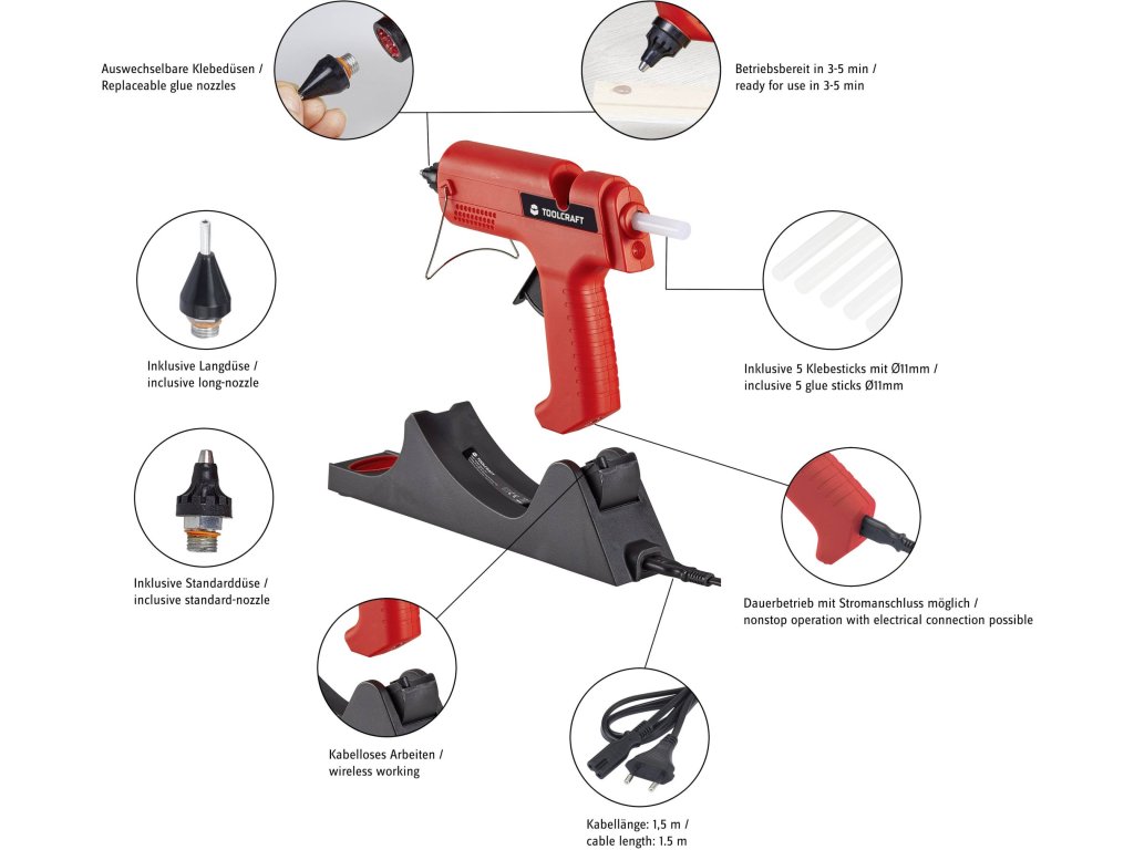 Akumulátorová tavná lepiaca pištoľ Toolcraft, 500 W Princip činnosti Po krátkom zahriatí v základnej stanici je tavná lepiaca pištoľ okamžite pripravená na flexibilné použitie bez kábla. Žiadne zamotávanie káblov Bezkáblová pištoľ na tavné lepidlo od spoločnosti Toolcraft umožňuje pohodlné a presné lepenie najrôznejších materiálov v domácnosti a dielni bez nepríjemných káblov. Rozsah použitia Ideálne na opravy, dekorácie, pre domácich mistrov a modelárov. Vhodné na takmer všetky materiály – napr. kartón, kov, drevo, kameň, plast, textil, sklo, papier, korok, dlaždice, kožu a mnohé ďalšie. Špeciálne vlastnosti: Flexibilné použitie Čas ohrevu: 3 - 5 min. Teplota tavenia: 170 °C PTC topné teleso Vlastnosti: tepelná ochrana: tepelná ochrana proti prehriatiu: Použitie bez káblov Mechanický prívod Trysky s ochranou proti kvapkaniu (dlhé/krátke) Pre lepiace tyčinky s priemerom 11 mm Rozsah dodávky: 1x lepiaca pištoľ 2 1x nabíjací kábel 5x lepiaca tyčinka, priehľadná, 11,2 x 150 mmDodatočné parametre