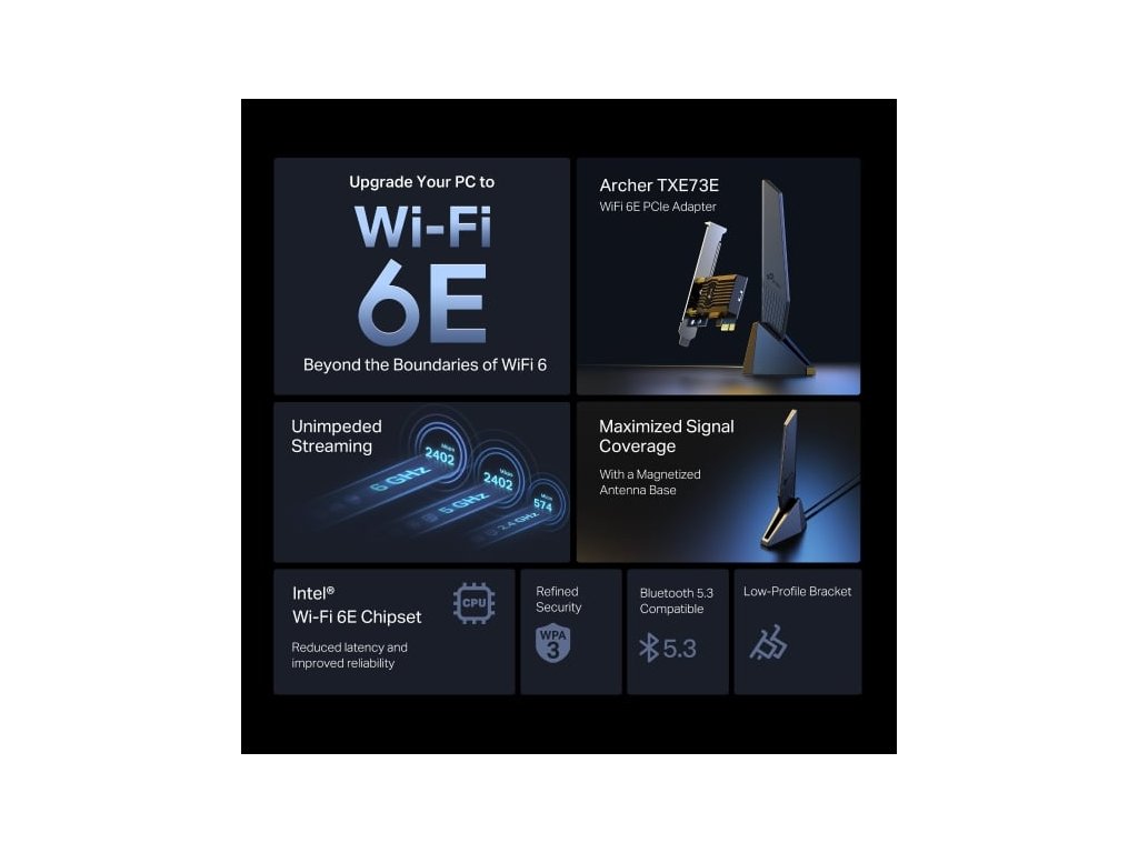 TP-Link Archer TXE73E - Adaptér Wi-Fi 6E PCIeTento adaptér ponúka bezkonkurenčnú trojpásmovú rýchlosť až 2402 Mb/s (6 GHz),