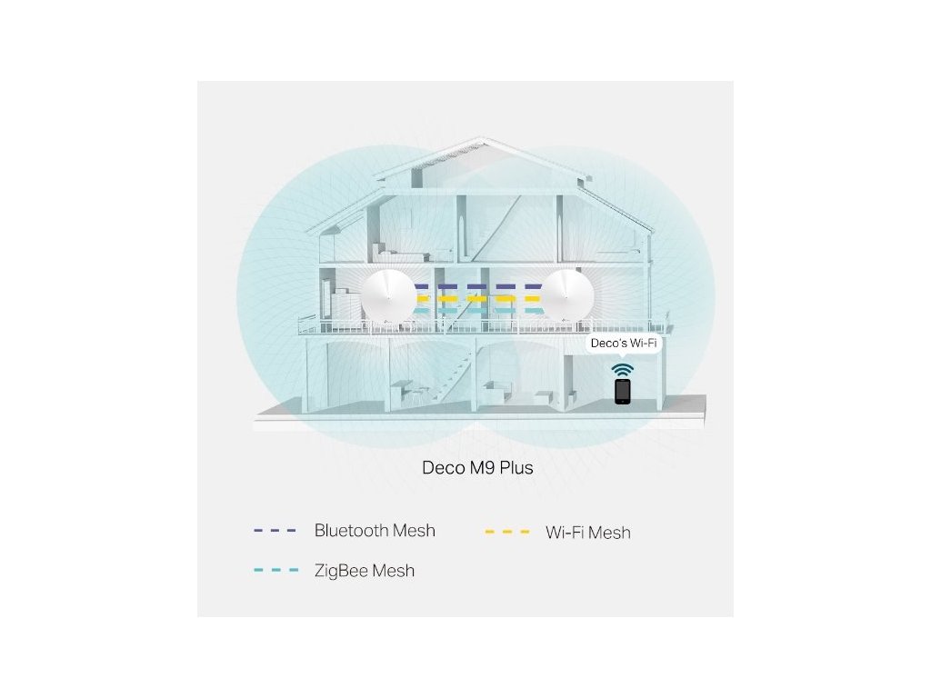 Deco využíva systém jednotiek, vďaka ktorým zaistí všadeprítomné pokrytie domu Wi-Fi signálom – raz a navždy môžete seba aj všetkých ostatných zbaviť miest so slabým signálom! Vďaka vyspelej technológii Deco Mesh Technology môžu jednotlivé jednotky spolupracovať a tvoriť v celom dome jednu ucelenú sieť s jedným názvom. Zariadenia sa budú automaticky pripájať vždy k tej jednotke Deco, ktorá mu pri prechádzaní celým domom zaistí najrýchlejšie možné pripojenie. Základná verzia Deco M9 Plus obsahuje dve jednotky, ktoré pokryjú plochu až 600 m2. A keby ani to nestačilo, stačí kedykoľvek pridať do siete ďalšie jednotky Deco a pokrytie tak rozšíriť. Tri samostatné pásma poskytujú rýchle a stabilné pripojenie s celkovou rýchlosťou až 2134 Mb/s. Systém Deco M9 Plus sa chová ako prepojovací uzol (húb) pre všetky zariadenia vo vašej chytrej domácnosti. Na jednej platforme tak môžete upraviť nastavenia a vytvárať vzájomné interakcie - už nemusíte zhotovovať špecializované chytré huby. Deco dokáže zvládať prevádzku aj pre veľmi zaťažené siete a poskytuje pripojenie bez zadrhávania a oneskorenia pre viac ako 100 zariadení súčasne. Bezpečnostný balík TP-Link HomeCare™ je sada individuálne prispôsobených a zabezpečených funkcií, ktorá obsahuje rodičovskú kontrolu, integrovaný antivírus a riadenie kvality služieb (QoS). Nastavenie je ešte jednoduchšie ako doteraz vďaka aplikácii Deco, ktorá vás prevedie jednotlivými krokmi.Dodatočné parametre