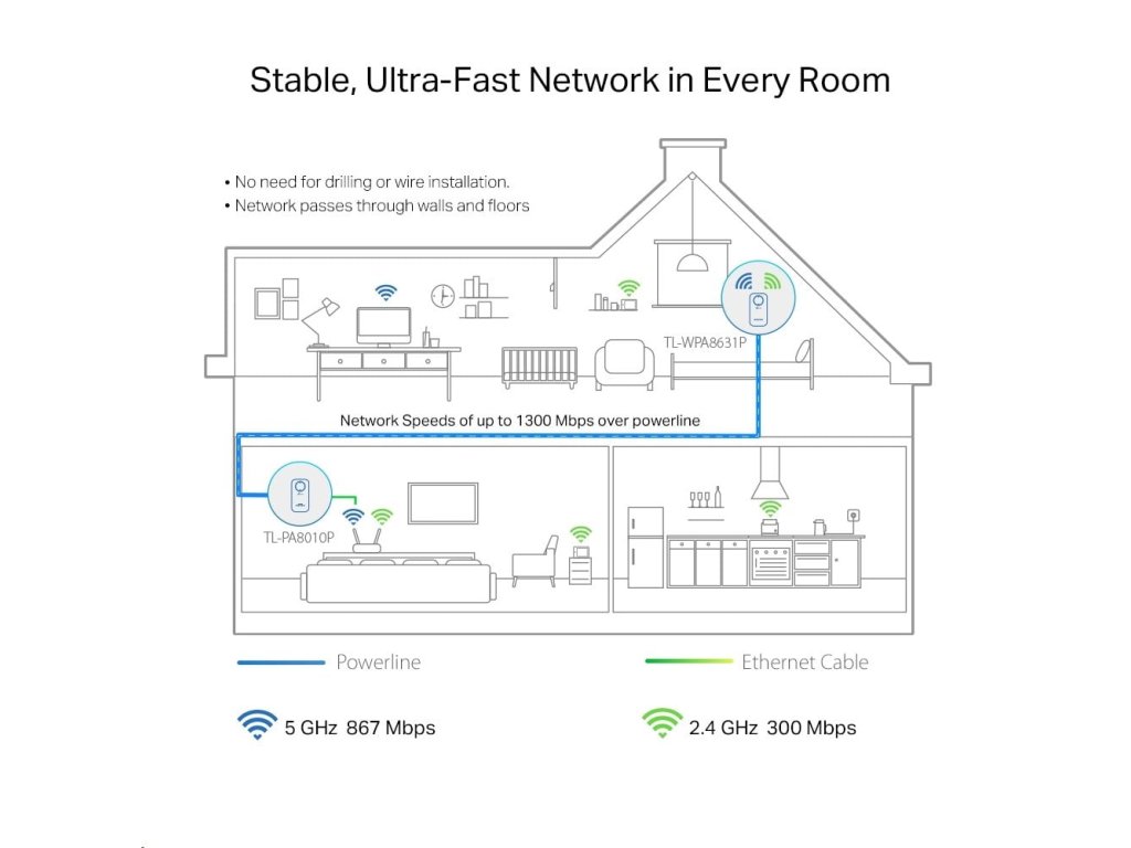Síť Wi-Fi, ktorá prechádza stenami a dá sa rozšíriť do každej zásuvky. - Štandard HomePlug AV2 - poskytuje ultrarýchly prenos dať po elektrickom vedení až do 1300 Mbit/s - Dvojpásmová sieť Wi-Fi AC1200 - zariadenie rozširuje ultra rýchlu dvojpásmovú sieť Wi-Fi s rýchlosťou až 867 Mbit/sv pásme 5 GHz a až 300 Mbit/s. - OneMeshTM - spolu so smerovačom podporujúcim OneMeshTM vytvára jednotnú sieť Mesh na bezproblémové streamovanie, aj keď sa pohybujete po dome. - 2×2 MIMO - vytvára viacero súčasných pripojení, ktoré vám poskytnú vyššie rýchlosti a lepšiu stabilitu pri prenose dať cez elektrické vedenie. - Konfigurácia Wi-Fi jedným dotykom - jediným dotykom tlačidla Wi-Fi zkopírujete názov siete a heslo zo smerovača. Všetky zmeny konfigurácie sa automaticky aplikujú na celú sieť Powerline. - Automatická synchronizácia Wi-Fi - Stlačením tlačidla párovania pridáte do siete Powerline ďalšie opakovače signálu a jednotne synchronizujete parametre nastavenia, ako je názov SSID, heslo, plán Wi-Fi a plán LED pre všetky sieťové zariadenia. - Prídavná elektrická zásuvka - napájanie z elektrickej zásuvky môžete použiť na napájanie ďalších zariadení pomocou integrovanej elektrickej zásuvky. - 3 gigabitové porty - ponúka prístup k zabezpečenej káblovej sieti pre stolové počítače, inteligentné televízory alebo herné konzoly.Dodatočné parametre