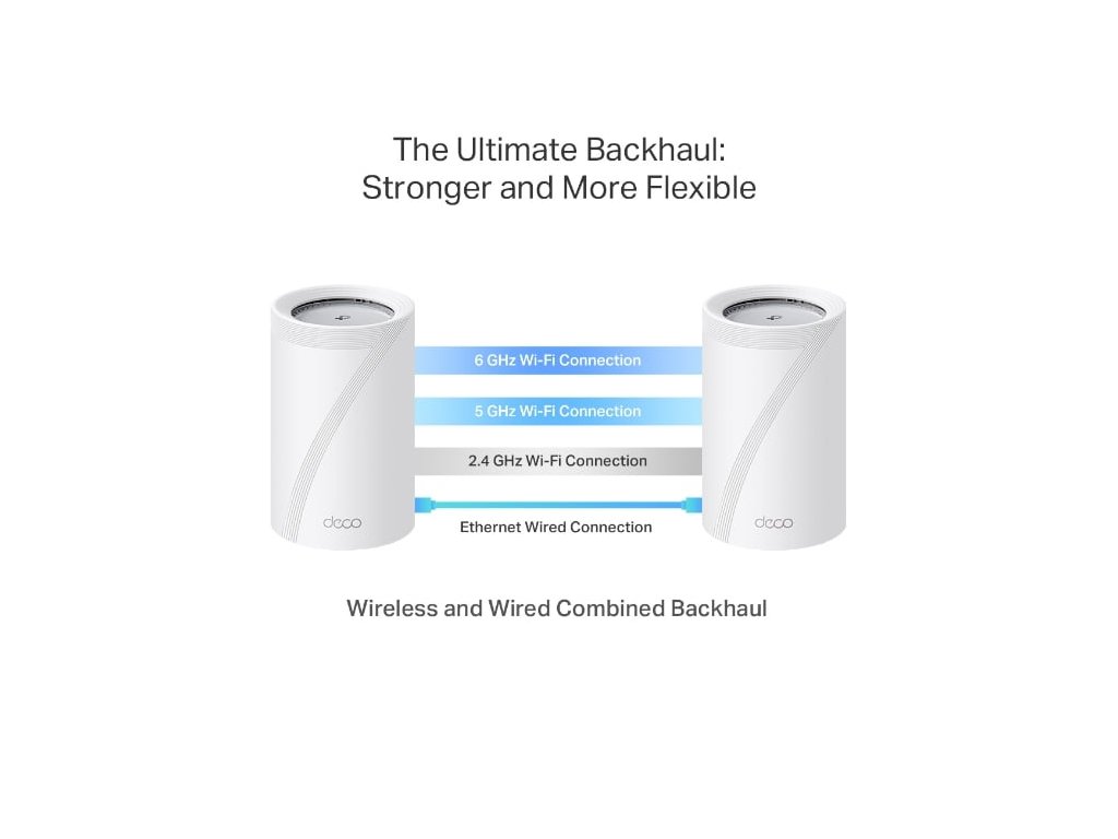 Deco BE65 Pro(1-pack) Parametry: * 9,3 Gb/s třípásmové Wi-Fi – 5765 Mb/s (6 GHz) + 2882 Mb/s (5 GHz) + 688 Mb/s (2,4 GHz). 1 * 5 Gb/s drátové připojení – 2× 5 Gb/s porty a 1× 2,5 Gb/s port zajišťují maximální flexibilitu a zvýšenou propustnost. 3 * Kombinovaný bezdrátový a drátový zpětný kanál – Připojuje bezdrátový a drátový zpětný kanál s každou jednotkou současně pro zlepšení celkové propustnosti a snížení latence. * Multi-Link Operation (MLO) – Současně odesílá a přijímá data přes různé pásma a kanály pro zvýšení propustnosti, snížení latence a zlepšení spolehlivosti.2 * 320 MHz kanály – Zdvojnásobuje šířku pásma a umožňuje mnohem více současných přenosů při nejvyšších možných rychlostech.2 * Funguje v pásmu 6 GHz – Minimalizuje přetížení díky greenfield spektru a zajišťuje spolehlivé vysokorychlostní připojení.2 * TP-Link HomeShield – Poskytuje komplexní ochranu sítě, robustní rodičovskou kontrolu a zabezpečení IoT v reálném čase. * Univerzální kompatibilita – Zpětně kompatibilní se všemi generacemi Wi-Fi a funguje s jakýmkoliv poskytovatelem internetu (ISP) a modemem. Odkaz na web výrobce: https://www.tp-link.com/cz/home-networking/deco/deco-be65-pro/(eu)%20v1%20(1-pack) Legenda: 1 Maximální bezdrátové rychlosti signálu jsou fyzické rychlosti odvozené ze specifikací standardu IEEE 802.11. Připojení až 200 zařízení je založeno na laboratorních testech, které analyzovaly připojení různých zařízení současně v pásmech 6 GHz, 5 GHz a 2,4 GHz. Tato zařízení simulovala typický domácí scénář tím, že současně běžely aplikace ve stejné místnosti, včetně 4K videa, 1080p videa, 720p videa, stahování souborů, prohlížení webu, IP kamer a dalších IoT zařízení. Skutečná bezdrátová propustnost, pokrytí a počet připojených zařízení nejsou zaručeny a mohou se lišit v závislosti na poskytovateli internetových služeb, síťových podmínkách, omezeních klientských zařízení a vlivech prostředí, včetně stavebních materiálů, překážek, objemu a hustoty provozu a umístění klienta. 2 Používání Wi-Fi 7 (802.11be), Wi-Fi 6 (802.11ax) a funkcí, včetně Multi-Link Operation (MLO), šířky pásma 320 MHz, 4K-QAM, Multi-RUs, OFDMA, MU-MIMO a BSS Color, vyžaduje, aby klientská zařízení také podporovala odpovídající funkce. Šířka pásma 320 MHz je dostupná pouze v pásmu 6 GHz. Současně nemusí být šířky pásma 160 MHz a 240 MHz nebo 320 MHz dostupné v pásmu 5 GHz nebo 6 GHz v některých regionech/zemích kvůli regulačním omezením. Dvojnásobná šířka kanálu a rychlost se vztahuje na 320 MHz ve srovnání s 160 MHz pro Wi-Fi 6 mesh. 3 Rychlosti internetu 5 Gb/s a 2,5 Gb/s vyžadují kompatibilní tarif a zařízení. Všechny WAN/LAN porty mohou fungovat jako WAN nebo LAN porty. Pouze jeden port může být současně portem WAN.Dodatočné parametre