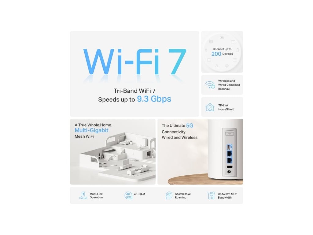 Deco BE65 Pro(3-pack) Parametry: * 9,3 Gb/s třípásmové Wi-Fi – 5765 Mb/s (6 GHz) + 2882 Mb/s (5 GHz) + 688 Mb/s (2,4 GHz). 1 * 5 Gb/s drátové připojení – 2× 5 Gb/s porty a 1× 2,5 Gb/s port zajišťují maximální flexibilitu a zvýšenou propustnost. 3 * Kombinovaný bezdrátový a drátový zpětný kanál – Připojuje bezdrátový a drátový zpětný kanál s každou jednotkou současně pro zlepšení celkové propustnosti a snížení latence. * Multi-Link Operation (MLO) – Současně odesílá a přijímá data přes různé pásma a kanály pro zvýšení propustnosti, snížení latence a zlepšení spolehlivosti.2 * 320 MHz kanály – Zdvojnásobuje šířku pásma a umožňuje mnohem více současných přenosů při nejvyšších možných rychlostech.2 * Funguje v pásmu 6 GHz – Minimalizuje přetížení díky greenfield spektru a zajišťuje spolehlivé vysokorychlostní připojení.2 * TP-Link HomeShield – Poskytuje komplexní ochranu sítě, robustní rodičovskou kontrolu a zabezpečení IoT v reálném čase. * Univerzální kompatibilita – Zpětně kompatibilní se všemi generacemi Wi-Fi a funguje s jakýmkoliv poskytovatelem internetu (ISP) a modemem. Odkaz na web výrobce: https://www.tp-link.com/cz/home-networking/deco/deco-be65-pro/(eu)%20v1%20(3-pack) Legenda: 1 Maximální bezdrátové rychlosti signálu jsou fyzické rychlosti odvozené ze specifikací standardu IEEE 802.11. Připojení až 200 zařízení je založeno na laboratorních testech, které analyzovaly připojení různých zařízení současně v pásmech 6 GHz, 5 GHz a 2,4 GHz. Tato zařízení simulovala typický domácí scénář tím, že současně běžely aplikace ve stejné místnosti, včetně 4K videa, 1080p videa, 720p videa, stahování souborů, prohlížení webu, IP kamer a dalších IoT zařízení. Skutečná bezdrátová propustnost, pokrytí a počet připojených zařízení nejsou zaručeny a mohou se lišit v závislosti na poskytovateli internetových služeb, síťových podmínkách, omezeních klientských zařízení a vlivech prostředí, včetně stavebních materiálů, překážek, objemu a hustoty provozu a umístění klienta. 2 Používání Wi-Fi 7 (802.11be), Wi-Fi 6 (802.11ax) a funkcí, včetně Multi-Link Operation (MLO), šířky pásma 320 MHz, 4K-QAM, Multi-RUs, OFDMA, MU-MIMO a BSS Color, vyžaduje, aby klientská zařízení také podporovala odpovídající funkce. Šířka pásma 320 MHz je dostupná pouze v pásmu 6 GHz. Současně nemusí být šířky pásma 160 MHz a 240 MHz nebo 320 MHz dostupné v pásmu 5 GHz nebo 6 GHz v některých regionech/zemích kvůli regulačním omezením. Dvojnásobná šířka kanálu a rychlost se vztahuje na 320 MHz ve srovnání s 160 MHz pro Wi-Fi 6 mesh. 3 Rychlosti internetu 5 Gb/s a 2,5 Gb/s vyžadují kompatibilní tarif a zařízení. Všechny WAN/LAN porty mohou fungovat jako WAN nebo LAN porty. Pouze jeden port může být současně portem WAN.Dodatočné parametre