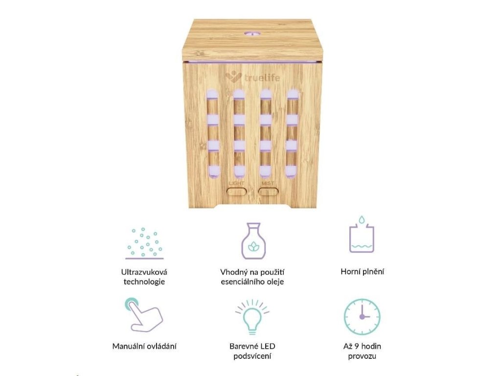 Aróma difuzér a zvlhčovač vzduchu Difúzer Truelife vyrobený z bambusového dreva v priebehu niekoľkých okamihov prevonia vzduch v miestnosti vašej obľúbenou vôňou. Na aromaterapiu sa nemusíte objednávať, s difuzérom si môžete vytvoriť atmosféru podľa svojich predstáv, či už sa chystáte meditovať alebo len príjemne relaxovať. Stačí pridat niekoľko kvapiek obľúbeného esenciálneho oleja do nádržky na vodu a technológia OilFlow® sa postará o zvyšok. Difúzer eliminuje okolité pachy a prevonia miestnosť vašou obľúbenou vôňou. Môžete ho však používať aj ako zvlhčovač vzduchu. Funguje na principe ultrazvuku, ktorý mení vodu v nádržke na jemnú paru, ktorá sa mieša so vzduchom v miestnosti a takmer okamžite ho zvlhčuje na optimálnu úroveň. Atmosféra, ktorú chcete Difúzer Truelife prevonia vzduch v miestnosti v okamihu, stačí pridať do nádržky niekoľko kvapiek esenciálneho oleja. Či už ste milovníkom aromaterapie, chcete si vytvoriť príjemnú relaxačnú atmosféru alebo vás trápia nepríjemné pachy z okolia, difuzér je pre vás ideálnym nástrojom. Funguje na principe ultrazvuku, ktorý mení vodu v nádržke na jemnú paru. Môžete si vybrať zo 14 rôznych farieb LED podsvietenia. Poteší vás aj jeho kvalitný materiál a luxusný dizajn. 2v1 Difúzer funguje aj ako zvlhčovač vzduchu, takže ak nemáte náladu na aromaterapiu, stačí naplniť nádržku vodou. Stlačením tlačidla na spustenie procesu zvlhčovania začne difuzér vypúšťať do vzduchu v miestnosti jemnú paru, ktorá ho okamžite začne zvlhčovať na optimálnu úroveň. Správna vlhkosť vzduchu prospieva dýchacím cestám a môže pomôcť pri problémoch so suchou pokožkou, ekzémoch alebo astme. Jednoducho nastavte požadované množstvo pary pomocou príslušného tlačidla. Dlhá životnosť, nízka hlučnosť, jednoduché používanie Nádržka na vodu difuzéra má kapacitu 200 ml a vydrží 9 hodín nepretržitého prevádzky. Difúzer môžete nechať zapnutý aj cez noc, vďaka nízkej hlučnosti nebude rušiť váš spánok. Vďaka automatickému indikátoru nedostatku vody sa difuzér sám vypne, keď je hladina vody nízka. Nehrozí tak riziko skratu alebo prehriatia. Obsluha je veľmi jednoduchá a zvládne ju každý. Na ovládanie difuzéra slúžia dve tlačidlá, ktorými ho zapnete a vypnete, prípadne nastavíte požadovanú intenzitu pary alebo farbu podsvietenia LED. Ultrazvuková technológia Difúzer funguje na principe ultrazvukovej technológie, ktorá premieňa vodu v nádržke na jemnú paru, ktorá sa mísi so vzduchom v miestnosti. Vrchné plnenie Difúzer sa veľmi ľahko plní vodou, stačí odstrániť kryt v hornej časti zariadenia a naliať vodu do nádržky. Pravý bambus Difúzer je vyrobený z pravého bambusového dreva. Nejde o žiadnu napodobeninu. Vhodný na používanie esenciálnych olejov Do nádržky na vodu môžete pridať esenciálny olej alebo vôňu podľa vlastného výberu a vytvoriť príjemnú atmosféru. Technológia OilFlow® Vďaka jedinečnej technológii OilFlow® stačia na celú nádržku dve až tri kvapky esenciálneho oleja. Môžete si tak v izbe vychutnávať aromaterapiu bez toho, aby ste museli neustále pridávať olej ako pri iných difuzéroch. Manuálne ovládanie Dve tlačidlá slúžia na zapnutie a vypnutie difuzéra, výber farby podsvietenia a nastavenie intenzity pary. 3 režimy pary Môžete si vybrať z troch režimov intenzity pary - vysoký výkon, nízky výkon a prerušovaný režim. Vďaka režimu vysokého výkonu máte dostatok pary na rýchle prevoňanie miestnosti. Na druhej strane režim nízkeho výkonu a prerušovaný režim vám poskytnú dlhotrvajúcu paru. 14 farieb LED podsvietenia Difúzer umožňuje 14 možností farebného podsvietenia a rôznych režimov. Až 9 hodín prevádzky Kapacita nádržky postačuje až na 9 hodín nepretržitého prevádzky difúzora. Žiadne toxické látky Difúzer je úplne bez toxických látok BPA. Je preto úplne bezpečný pre celú rodinu, dokonca aj pre malé deti. Nemusíte sa teda ničoho obávať a môžete difuzér používať každý deň aj noc. Automatické vypnutie v prípade nedostatku vody Difúzer monitoruje hladinu vody v nádržke a upozorní vás na nedostatok vody, potom sa automaticky vypne. Program AIR Zabezpečte kvalitný vzduch pre vás a vašu rodinu pomocou nášho programu TrueLife AIR. Viac informácií nájdete na truelife.eu/air. Parametre Difúzer TrueLife AIR D7 Bamboo Doporučená plocha miestnosti 25 m2 Prevádzkový čas Až 9 hodín Spotreba 7 W Ultrazvukový systém ANO Počet úrovní výkonu 3 - vysoký výkon, nízky výkon, prerušovaný režim Kapacita nádržky na vodu 200 ml Aromaterapia Ano 1× TrueLife AIR difúzor D7 Bamboo 1× adaptér 1× príručka 1× bezpečnostné pokynyDodatočné parametre