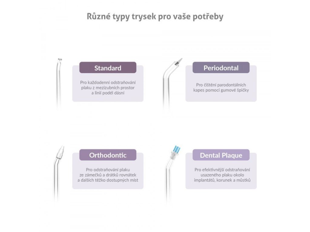 Inteligentné zariadenie pre dokonalú starostlivosť o zuby Doprajte si dokonalú každodennú dentálnu hygienu s dobíjacou ústnou sprchou TrueLife AquaFloss Compact C200. Jej používanie je šetrnejšie ako používanie zubnej nite a medzizubných kefiek a navyše šetrí peniaze. Väčšina zubných kazov vzniká v medzizubných priestoroch, ale vďaka technológiám StreamTrue®, PulseTrue® a 5 režimom čistenia nemajú šancu. Vďaka režimu DIY si navyše môžete nastaviť tlak podľa svojich potreb. Zásobník s objemom 300 ml pojme dostatok vody na kompletné čistenie, ktoré trvá 2 minúty a ktoré sleduje automatický časovač. Ústna sprcha má dva spôsoby plnenia vodou - zboku a zhora. Praktické plnenie zhora je rýchlejšie a užívateľsky prívetivejšie ako bočné plnenie štandardných ústnych sprch. Vďaka tomu je používanie ústnej sprchy pohodlné a časovo úsporné. Batérie sprchy vydržia pri používaní dvakrát denne až 14 dní. Kompaktný dizajn zariadenia umožňuje jeho jednoduché zbalenie na cesty a zabudovaný LCD displej zobrazuje zvolený režim a úroveň nabitia batérie. Pamäťová funkcia zabezpečuje, aby sa pri opätovnej aktivácii sprchy aktivoval naposledy použitý režim. Sprcha pokrýva rôzne zubné potreby prostredníctvom 4 priložených trysiek. Dokonalá a šetrná dentálna hygiena Pravidelné čistenie medzizubných priestorov působí ako prevencia vzniku zubného kazu a je jednoduchšie a šetrnejšie ako čistenie zubnou niťou alebo používanie medzizubných kartáčkov vďaka TrueLife AquaFloss Compact C200. Stačí naplniť 300ml nádržku vodou z hornej alebo bočnej strany a vybrať jeden z 5 prednastavených režimov, pričom režim DIY umožňuje nastaviť tlak podľa vašich potreb. Sprcha je tiež vybavená technológiou StreamTrue®, ktorá fúka mikrobublinky zložené z vody a vzduchu aj do tých najtesnejších priestorov, aby účinne odstranila zubný povlak, baktérie a zbytky jedla. Inteligentné funkcie a technológie Súčasťou balenia ústnej sprchy sú 4 trysky pokrývajúce rôzne potreby zubov. Lepšiemu prekrveniu a regenerácii dásní napomáha technológia PulseTrue®, ktorá masíruje dásne vytváraním pulzných vln, ktoré striedavo znižujú a zvyšujú prietok vody. Sprcha je vybavená časovačom nastaveným na ideálne 2 minúty čistenia, po ktorých sa zariadenie automaticky vypne. Pamäťová funkcia zabezpečuje, že sa pri opätovnej aktivácii automaticky spustí naposledy použitý režim. Jednoduchá manipulácia a dlhá životnosť Ústnu sprchu nie je potrebné pri používaní zapájať do elektrickej siete, ho nabíjateľná batéria vydrží 14 dní pri používaní dvakrát denne po 2 minúty. Nabíjanie sa vykonáva prostredníctvom kábla USB. Manipulácia so sprchou je tiež veľmi pohodlná a jednoduchá, čo zvládnete okamžite. Kompaktný dizajn navyše umožňuje vzať si sprchu kamkoľvek so sebou. LCD displej prehľadne zobrazuje aktuálny zvolený režim a úroveň nabitia batérie. Prispôsobí sa vašim potrebám Vďaka funkcii DIY si môžete nastaviť intenzitu tlaku vody presne podľa svojich predstáv, a to v rozsahu 8-110 PSI. Sprcha obsahuje 4 špeciálne trysky (1× štandardná, 1× ortodontická, 1× parodontálna, 1× na zubný povlak) určené pre rôzne potreby: Štandardná – slúži na odstránenie zubného povlaku medzi zubami a podél línie dásní. Ortodontická - Ortodontická tryska na odstraňovanie zubného povlaku zo zámienkov a drôtov rovnátok a iných ťažko prístupných miest. Periodontálna - parodontálna tryska na čistenie parodontálnych vreciek pomocou gumového hrotu. Zubný povlak - Používa sa na účinnejšie odstraňovanie nánosov povlaku okolo implantátov, koruniek a mostíkov. Technológia StreamTrue® Mikrobublinky vytvorené z vody a vzduchu sú pod vysokým tlakom vtláčané do medzizubných priestorov, čím sa účinne odstráni až 99 % zubného povlaku a nečistôt z ťažko prístupných miest. Technológia PulseTrue® V režime Pulse je zariadenie schopné vytvárať pulzné vlny, ktoré znižujú a zvyšujú intenzitu prúdu vody. Výsledkom je masírovanie dásní, prekrvenie a pomoc pri ich regenerácii. 5 režimov čistenia Sprcha ponúka 5 režimov čistenia s rôznou intenzitou tlaku (8-110 PSI), od najnižšieho až po hĺbkové čistenie. Funkcia "urob si sám Pomocou funkcie DIY môžete nastaviť intenzitu tlaku vody podľa svojich predstáv a vytvoriť si vlastný režim čistenia. 1 nabitie = 14 dní Batéria vydrží na jedno nabitie 14 dní a vďaka káblu USB ju možno nabíjať aj z powerbanky. Vďaka tomu je ideálny na cesty. Časovač So správnym časom čistenia vám pomôže automatický časovač. Sprcha je vybavená funkciou Memory, ktorá si pamatuje naposledy použitý režim. 4 trysky v balení Vďaka 4 rôznym typom trysiek série C, ktoré sú súčasťou balenia, môže sprchu používať celá rodina. ústnej dutiny. Zásobník s objemom 300 ml. Zásobník s objemom 300 ml je dostatočne veľký na vyčistenie celého chrupu a zároveň dostatočne kompaktný.m čistej vody ju môžete naplniť aj ústnou vodou pre väčšiu sviežosť. Možnosť dvojitého plnenia Zásobník môžete pohodlne naplniť dvoma spôsobmi: zhora a zboku. Plnenie zhora s väčším otvorom je oveľa rýchlejšie a jednoduchšie vďaka možnosti vybrať celý zásobník. Vodotesná konštrukcia Sprcha je vodotesná podľa štandardu IPX7, takže ju môžete používať aj v sprche. Parametre: Výdrž batérie 14 dní (2 minúty 2 krát denne) 5 režimov (jemný, stredný, silný, pulzný, DIY) Časovač Áno (2 minúty) Pamäť Áno Prídavné hlavice série C (štandardná, ortodontická, parodontálna, na zubný povlak) Objem zásobníka 110 PSI Rozmery 63 × 220 × 73 mm (š × v × h) Hmotnosť 239 g Vodotesnosť IPX7 Obsah balenia: Ústna sprcha AquaFloss Compact C200 Náhradné t