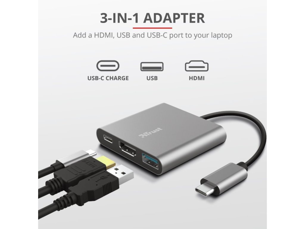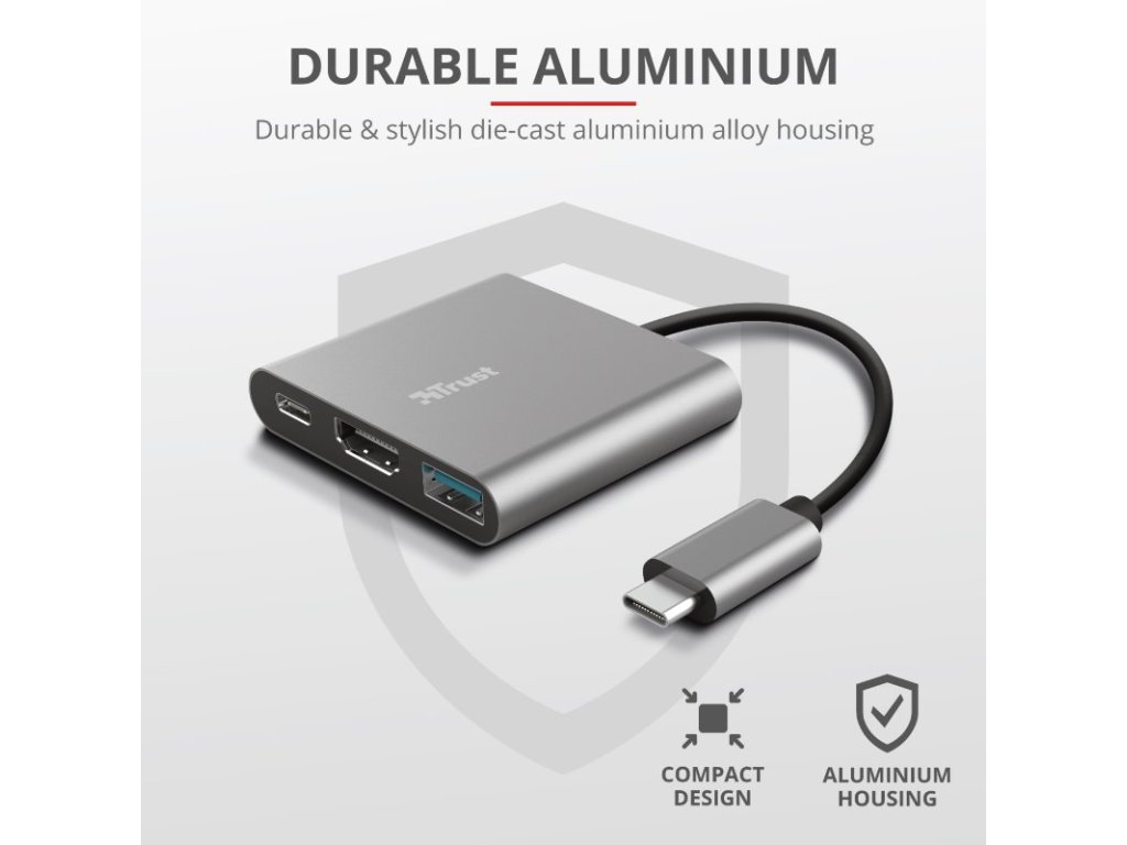 TRUST Dalyx 3-v-1 multiportový adaptér USB-C. Štýlový hliníkový 3-portový adaptér USB-C, ktorý pridá do vášho notebooku porty USB a HDMI a nabíjací port typu C. Kľúčové vlastnosti Pridajte k svojmu notebooku ďalšie porty HDMI a USB a nabíjací port USB-C s jedným portom USB-C Port HDMI na pripojenie monitora alebo televízora Obraz vo vysokom rozlišení so sýtymi farbami vďaka HD4. je klávesnica, myš a externý disk Podporuje prenos dať rýchlosťou až 5 Gb/s cez USB 3.2 Gen 1 Port USB-C PD na nabíjanie notebooku s výkonom až 100 W Odolná a štýlová hliníková zliatina odliata pod tlakom Tenký a kompaktný, ľahko sa prenáša na cestách Špecifikácia Dĺžka hlavného kábla: : 1 . 1.4 Rozlíšenie: 4K 30 Hz Pripojenie pre: USB-C, HDMI, USB-A Rozmery: 11 x 58 x 51 mm Hmotnosť: 38 gDodatočné parametre