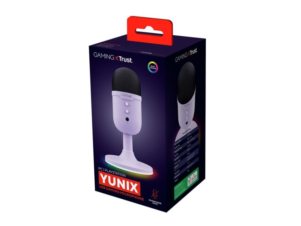 Trust Gaming GXT 234P Yunix kompaktní USB herní mikrofon ideální pro streamování a tvorbu obsahu * multiplatformní funkce umožňují používat mikrofon s počítačem, konzolí PlayStation nebo počítačem Mac * praktický stojan s RGB LED osvětlením a nastavitelným úhlem v sobě spojuje styl i kvalitu * zásluhou kardioidního záznamového vzoru bude váš hlas slyšet jasně a zřetelně * snadný přístup k funkci ztlumení mikrofonu pomocí praktického tlačítka na přední straně * vestavěný pop filtr mikrofonu zajišťuje filtrování jen toho, co chcete, aby bylo slyšet * výstup pro sluchátka vám umožní poslouchat, co nahráváte Technické parametry Hladina akustického tlaku: 100 dB Maximální vzorkovací frekvence: 48 kHz/16 bitů Podsvícení: ano Poměr signálu k šumu: 62 dB Frekvenční rozsah: 100Hz-16kHz Impedance: 2200 Ohmů Citlivost: 32 dB Ztlumení mikrofonu: ano Typ připojení: 3,5mm, USB-A Délka kabelu: 1,8m Barva: fialová (purple) Rozměry: 108x55x55mm Hmotnost: 216g Požadavky na systém: volný port USB, Windows, macOS, Chrome OS Obsah balení: * herní mikrofon * návod k použití Záruka: 2 roky Odkaz na stránku výrobce: https://www.trust.com/en/product/25375-gxt-234-yunix-usb-gaming-microphone-purpleDodatočné parametre