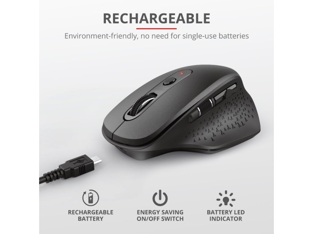 TRUST Ozaa Dobíjacia bezdrôtová myš. Špičková bezdrôtová myš v pohodlnom dizajne so zabudovanou dobíjacou bateriou. Kľúčové vlastnosti Špičková bezdrôtová myš s ergonomickým dizajnom, ktorý poskytuje hodiny pohodlnej práce Šetrná k životnému prostrediu, vďaka zabudovanej nabíjateľnej baterii nie sú potrebné batérie DPI) Nabíjanie cez port micro-USB pomocou priloženého kábla Bezdrôtový dosah až 10 metrov Prijímač USB typu plug-and-play Prepínač úspory energie Technické parametre Typ pripojenia: bezdrôtové Max. DPI: 2400 dpi Technológia snímača: optická Bezdrôtový dosah: 10 m Bezdrôtové protokoly: RF 2,4 GHz USB prijímač v balení: áno Verzia USB: 2.0 Typ konektora prijímača: USB-A Nabíjateľná batéria: ánoDodatočné parametre