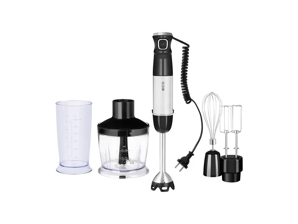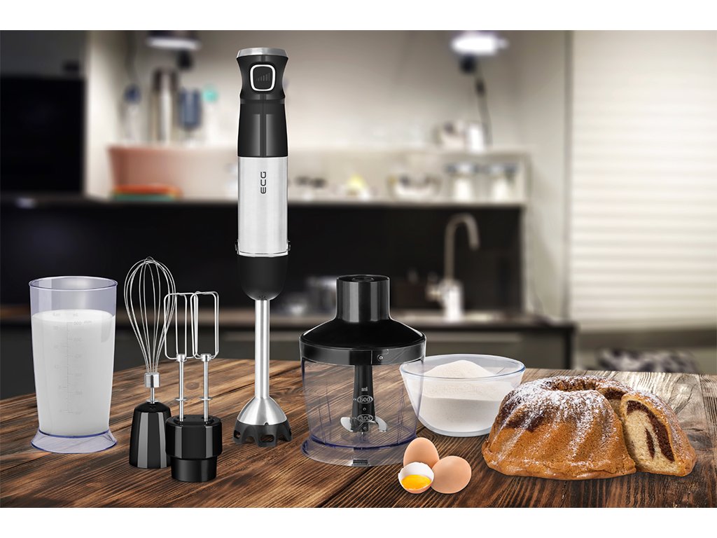 tyčový mixér, výkonný 800 W motor, kovová noha so 4 čepeľami z nehrdzavejúcej ocele, 500 ml sekacia nádoba so samostatným nožom, 600 ml odmerná nádoba, nadstavec na šľahanie snehu, dvojitý šľahací nástavec na šľahanie krémov, dizajn z nehrdzavejúcej ocele krúteným káblom, hlučnosť 85 dBDodatočné parametre
