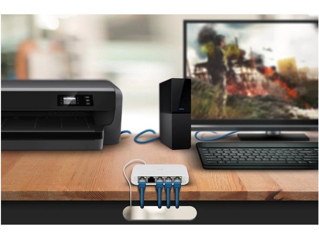 USW-Flex-Mini je maličký 5-portový Gigabitový switch so správou cez UniFi Controller od Ubiquiti Networks v desktop prevedení s prvým portom podporujúci PoE In. PoE IN na Eth1 Jeho najväčšou prednosťou je gigabitový POE IN na porte č.1 pre ľahkú expanziu siete aj do miest, kde nie je možné vybudovať elektrickú zásuvku. Switch je možné napájať ako aktívne (802.3af/at), tak pasívne pomocou 44-57V adaptéra. Switch je možné okrem PoE napájať aj cez USB-C adaptér so špecifikáciou 5V/1A. Management cez UniFi Controller Zásadný rozdiel medzi switchom radu UniFiSwitch a radom EdgeSwitch je v manažmente - WebGUI manažment switchov EdgeSwitch je u modelov UniFiSwitch nahradený UniFi Controllerom. Obsah balenia Zariadenie Napájací adaptér 5V/1ADodatočné parametre