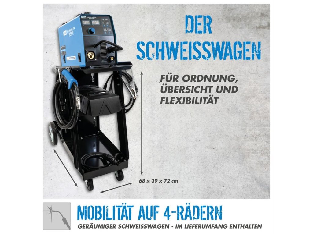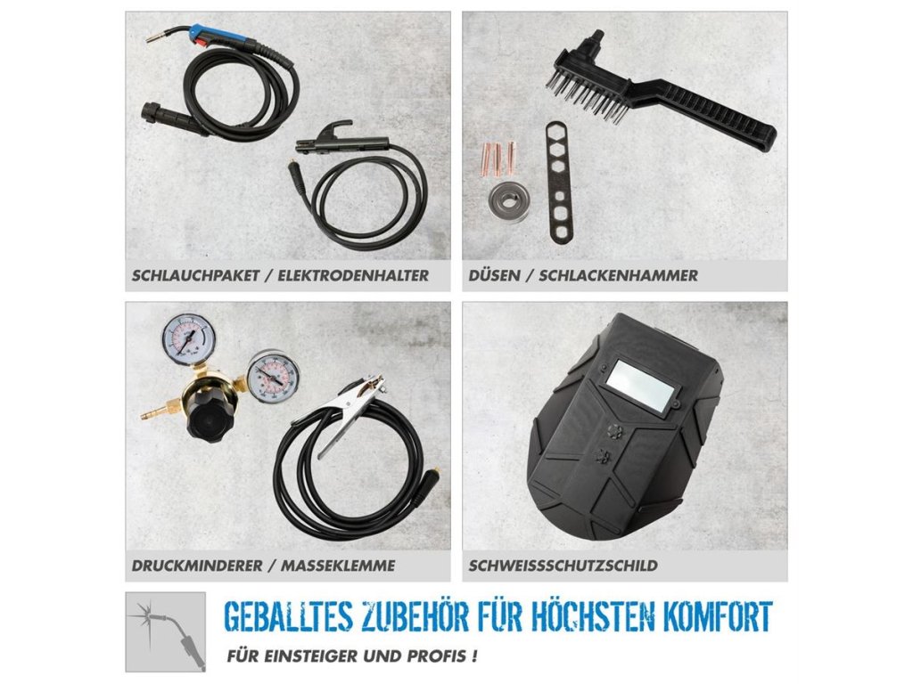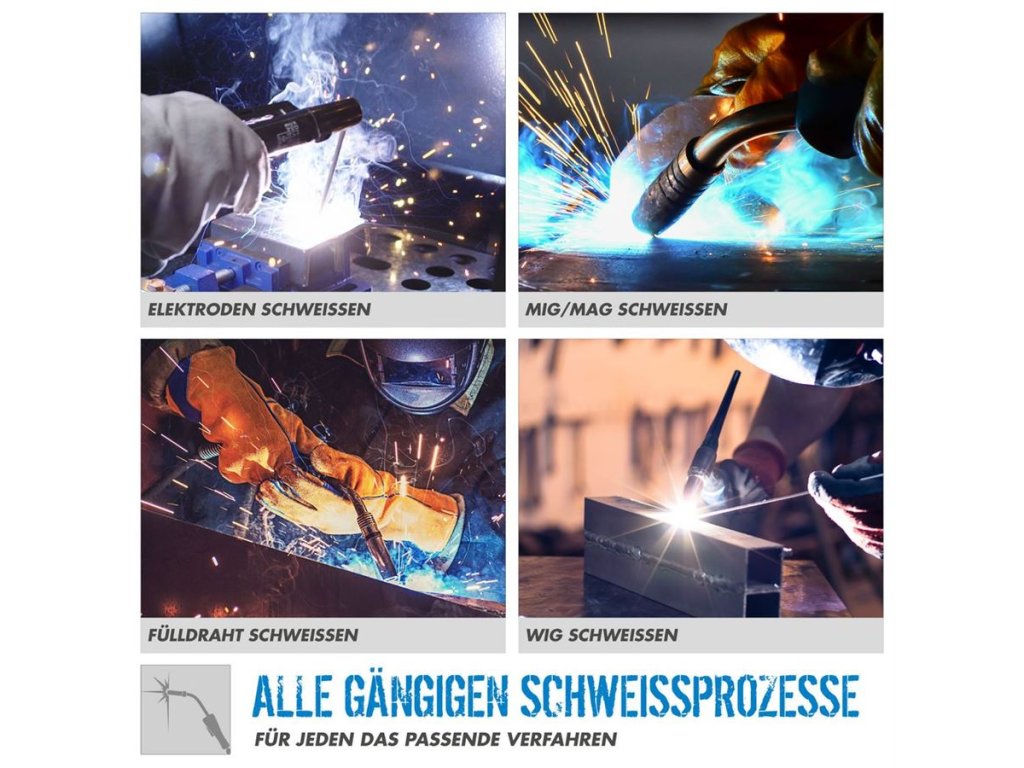 Invertorová zváračka Uni-Mig 205 SYN je jednou z univerzálnych invertorových zváračiek v sortimente spoločnosti Güde. Osvedčené prídavné funkcie, ako sú Anti-Stick (zabraňuje prilepeniu elektródy k obrobku), Hot Start (pre optimálne zapálenie elektródy) a Arc Force (stabilizuje oblúk automatickým nastavením zváracieho prúdu a tým zabezpečuje dokonalé výsledky zvárania), zabezpečujú maximálny komfort zvárania aj v náročných podmienkach. Nový, inovatívny synergicky riadený posuv drôtu sa po zvolení zváracieho procesu, hrúbky drôtu a sily zvárania automaticky nastaví na správnu rýchlosť. Tieto doplnkové funkcie umožňujú najmä začiatočníkom a neskúseným zváračom okamžite dosiahnuť dobré výsledky zvárania. Súčasťou štandardnej výbavy je držiak elektródy a kotviaca svorka, ako aj kladivo s kefou pre procesy MMA. To isté platí pre horák MIG/MAG a regulátor tlaku ochranného plynu. Vhodné pre malé cievky a plastové cievky D200 (5 kg). Kryt z oceľového plechu s práškovou povrchovou úpravou, tepelná ochrana proti preťaženiu. 3 m horák (-> "EURO konektor"), 2,5 m uzemňovací kábel so zemniacou svorkou, 1,8 m držiak elektród 200 A. Tryska (0,6/0,8/0,9 mm). Dodáva sa spolu so zváracím štítom, struskovým kladivom s kefou a zváracím vozíkom na plynové fľaše. Parametre: Pripojenie 230 V~50 Hz Maximálny príkon 8,05 kVA Ochrana 16 A Prúdový rozsah 20 - 200 A Zaťažiteľnosť MIG/MAG/WIG/TIG 200 A - 15 % MMA zaťažovač 200 A - 30 % Odporúčaná hrúbka materiálu 1 - 12 mm Trieda izolácie H Typ ochrany IP 21 SDodatočné parametre