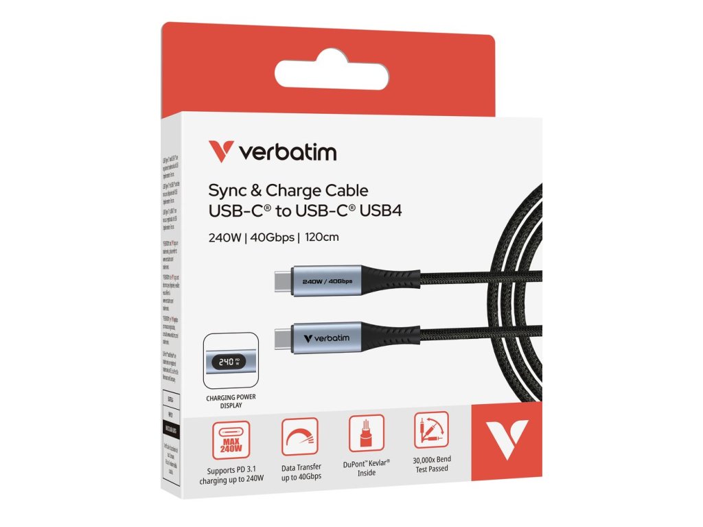 Bezkonkurenčná rýchlosť a výkon Kabel Verbatim Sync & Charge USB-C® na USB-C® na USB4 je navrhnutý pre výkonné zariadenia a poskytuje extrémne rýchle nabíjanie a prenos dát. Či už pracujete s náročnými aplikáciami alebo prenášate veľké súbory, tento kábel ponúka bezkonkurenčnú rýchlosť a výkon, takže je ideálny pre najnovšie zariadenia USB-C. Superrýchle nabíjanie na displeji Tento kábel podporuje nabíjanie PD 3.1 s výkonom až 240 W, takže rýchlo a efektívne napája aj tie najnáročnejšie zariadenia. Ponúka rýchlosť prenosu dať až 40 Gb/s, čím zabezpečuje rýchly prenos súborov a bezproblémovú synchronizáciu zariadení na prácu aj zábavu. Prenášajte veľké súbory, videa v rozlišení 4K/8K a ďalšie súbory v priebehu niekoľkých sekúnd a okamžite sledujte výkon nabíjania pomocou integrovaného LED displeja. Odolná a výkonná konštrukcia Tento kábel má nylonové vonkajšie opletenie, zesílené konektory z kovovej sliatiny a jadro z tvrdených aramidových vlákien. Prešiel prísnym testovaním a vydržal viac ako 30 000 ohybov, čo zaručuje, že vydrží každodenné opotrebovanie pri zachovaní špičkového výkonu. PODROBNOSTI O VÝROBKU Číslo produktu: 31849 Podporuje nabíjanie PD 3.1 s výkonom až 240 W na rýchle nabíjanie výkonných zariadení Nabíjajte notebooky, herné systémy a energeticky náročné zariadenia rýchlejšie ako kedykoľvek predtým pre maximálnu účinnosť Prenos dať rýchlosťou 40 Gb/s sekund vďaka najmodernejšej technológii USB4 Integrovaný nabíjací LED displej na okamžité monitorovanie výkonu nabíjania Vnútorné aramidové vlákna poskytujúce vynikajúcu pevnosť jadra Konektory z kovovej zliatiny so zvýšenou odolnosťou Opletený nylonový exteriér pre odolnosť voči oderu Testované na 30 00 notebookov a pracovných stanic Výkon pripravený na budúcnosť: USB4 zaručuje, že ste vybavení na pripojenie novej generácie, podporuje zariadenia Thunderbolt 3/4 1Dĺžka 20 cm: Ideálny na použitie doma, v kancelárii alebo na cestách Systémové požiadavky Na nabíjanie, synchronizáciu a prevádzku zariadení s pripojením USB-C. Špecifikácie Konektory: USB-C® na USB-C® Dĺžka: 120 cm Priemer: 5,1 mm Materiály: Hliník, nylon, TPE, vnútorné vlákna DuPont™ Kevlar® Rýchlosť prenosu dát: 1: Až 40 Gb/s Maximálny výstupný výkon: 240 W Štandardy nabíja Kevlar® sú ochranné známky alebo registrované ochranné známky pridružených spoločností DuPont de Nemours, Inc. Obsah balenia Kábel Verbatim Sync & Charge USB-C® na USB-C® so zobrazením napájania (240 W, 120 cm) Stručná príručkaDodatočné parametre