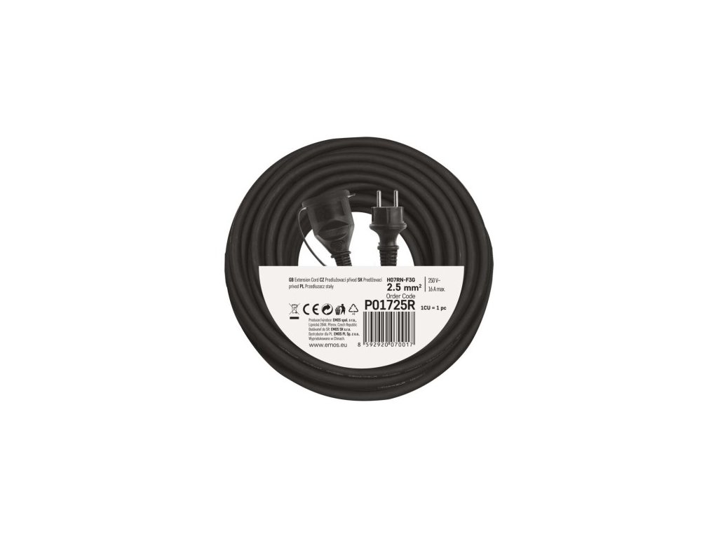Vysokokvalitný a bezpečný dizajn 25 m predĺžovacieho kábla, ktorý oceníte pri použití v interiéri aj exteriéri. Priveďte elektrinu tam, kde ju potrebujete. Výhody výrobkuKábel z chloroprénovej gumy pre stredne ťažké mechanické zaťaženie, odolný voči olejom. Prierez vodiča 2,5 mm2. IP44. Použitie v teplotnom rozsahu -35 °C až +60 °C. Farba kábla: čierna Ďalšie vlastnosti: nie dĺžka: 25 m detské clony: áno hmotnosť: nie je špecifikované krytie: IP44 max. zaťaženie v cievke: nie je špecifikované napätie: 230 V~ počet zásuviek: 1 predajné balenie: 1 kus, fólia veľkosť: nepoužije sa tepelná poistka: nie typ izolácie: guma/neoprén vodič: H07RN-F3G záručná doba: 2 roky vyvinuté zaťaženie: max. 16 A / 3 680 WDodatočné parametre