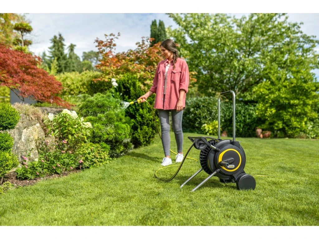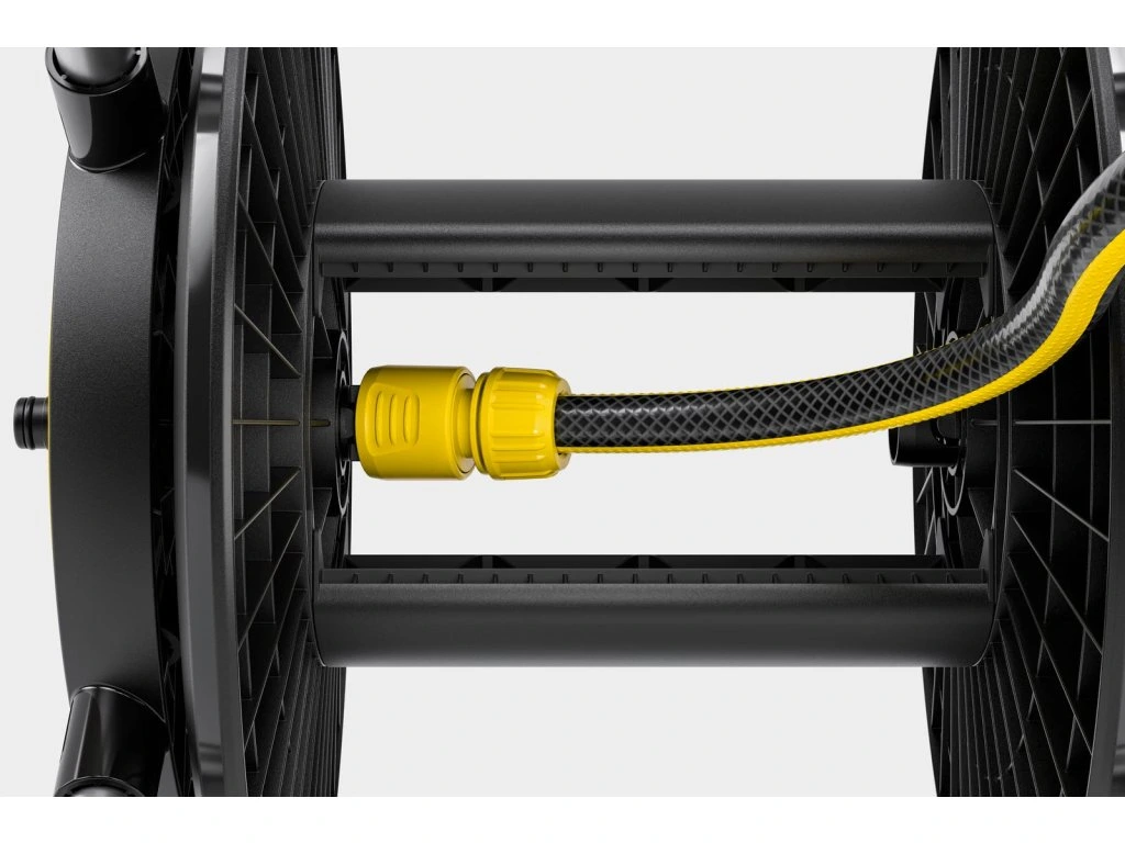 Robustné vedenie hadice: integrovaný mechanizmus zabezpečuje rovnomerné a čisté navíjanie hadice na bubon vrstvu po vrstve bez toho, aby ste ju museli ručne usmerňovať.Maximálna stabilita.