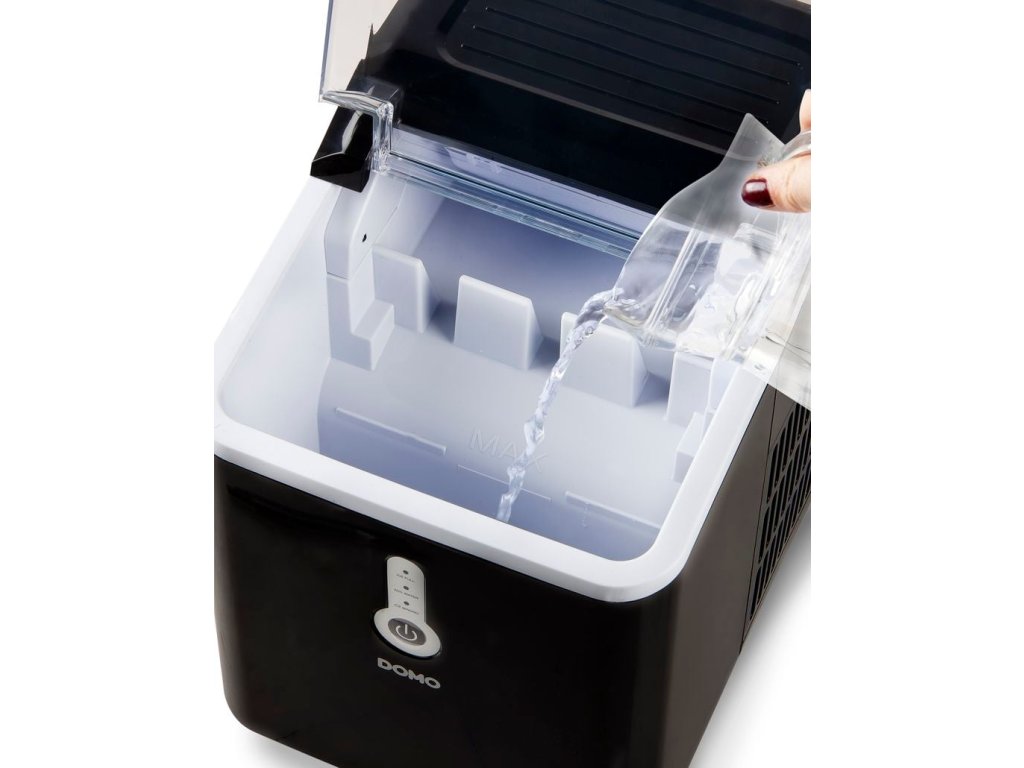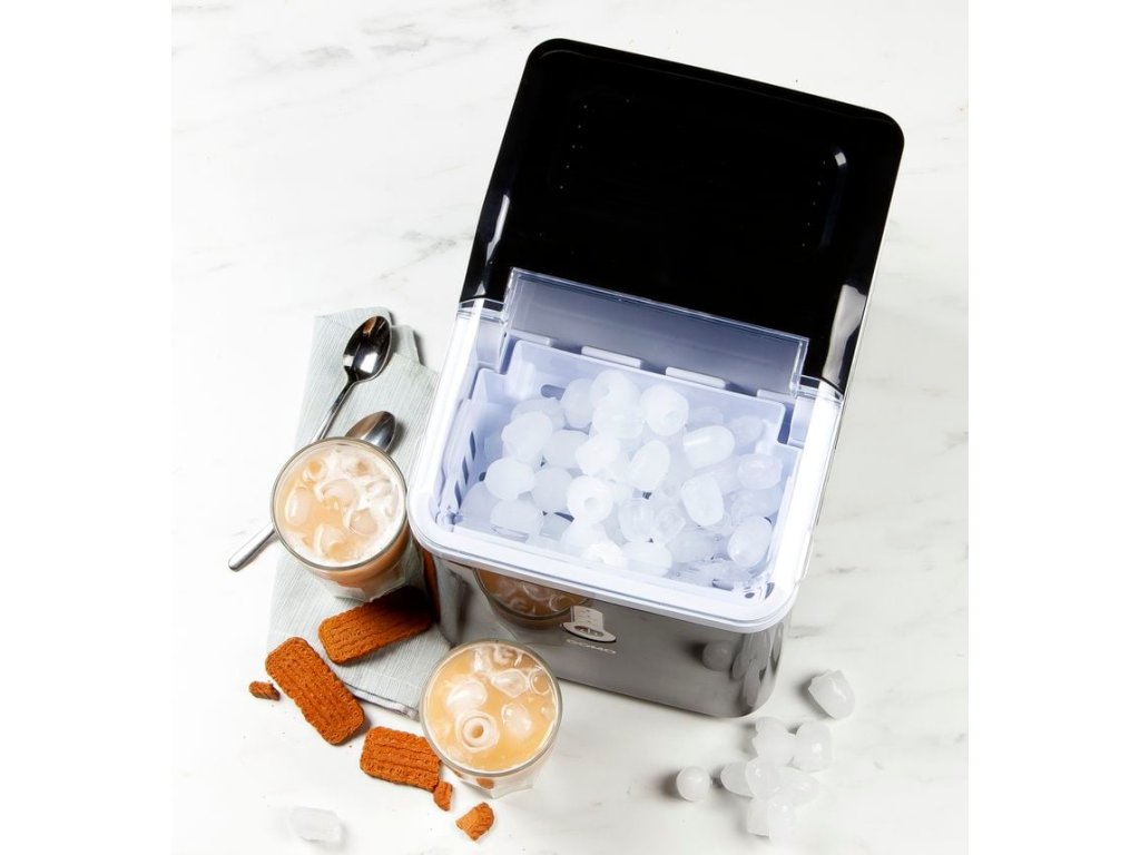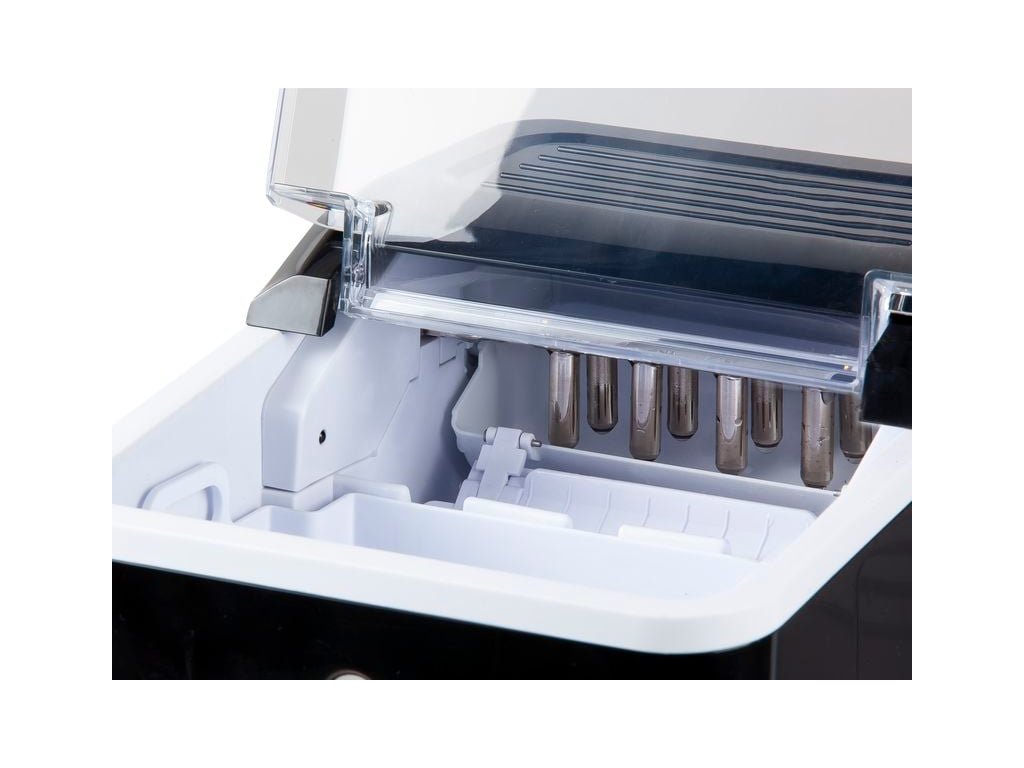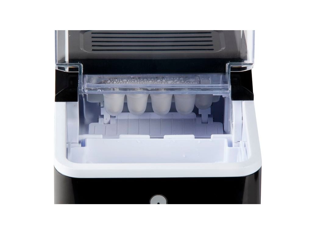 Výkonný výrobník ľadu v čiernej farbe s vlastným kompresorom s kapacitou až 12 kg kociek ľadu za 24 hodín. Okrem kompaktného minimalistického dizajnu poteší aj tichou prevádzkou a dlhým napájacím káblom. Výrobník ľadu možno umiestniť takmer kdekoľvek v kuchyni na každodenné použitie. Výrobník ľadu dokáže vyrobiť 9 kociek ľadu každých 8 minút. Zariadenie pre vás monitoruje množstvo vody a množstvo vytvorených kociek ľadu a vždy vás upozorní, keď je zásobník na vodu prázdny alebo zásobník na ľad plný, a automaticky sa vypne. Vďaka priehľadnému veku máte plnú kontrolu nad výrobou kociek ľadu bez toho, aby ste museli prístroj otvárať. Prístroj sa veľmi ľahko ovláda a stačí vám na to len jedno tlačidlo.Typ zariadenia: domáci výrobník ľadu