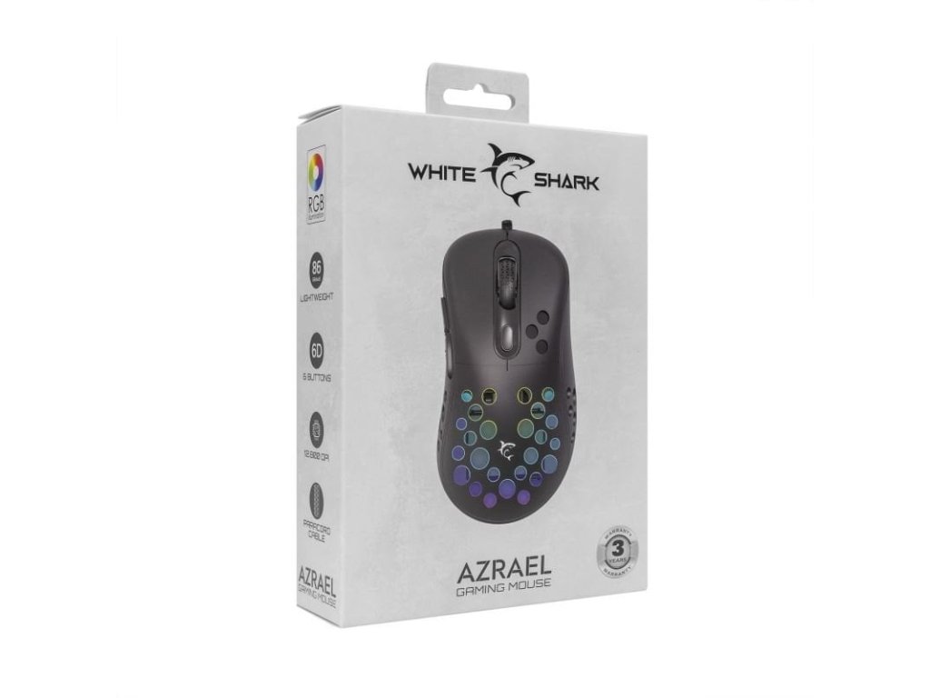 White Shark herní myš AZRAEL - Prožijte úroveň přesnosti a stylu s touto lehkou herní myší. Uvolněte přesnost a styl s herní myší White Shark AZRAEL. Díky 6 tlačítkům napájeným čipovou sadou Instant 825 nabízí životnost 10 milionů lisů s přepínači HUANO. Optický senzor 7200 DPI, zrychlení 20G ??a frekvence dotazování 1000Hz zajišťují rychlé a přesné pohyby. S elegantním matným povrchem, opleteným kabelem a hmotností 86 g je AZRAEL směsí výkonu a estetiky. White Shark herní myš AZRAEL je vaším dokonalým herním společníkem. Pouze 86 gramů 6D - 6 tlačítek 12 800 DPI (přes software) SPECIFIKACE Typ: 6D - 6 tlačítek Čipová sada: Instant 825 Životnost: 10 M lis - HUANO Zrychlení: 20G Software: Ano Barva: Černá Povrchová úprava: Matná Pletený kabel: Ano Typ snímače: Optický Rozlišení (DPI): 7200 (12800 SW) Polling rate (Hz): 1000 Osvětlení: RGB 16,8 M barev Spodní vycpávky: UPE Materiál: Plast Rozhraní: USB 2.0 Kompatibilita myši: Windows 7/8/10/11/MacOS ROZMĚRY A HMOTNOST Rozměry (mm): 123x64x43 Hmotnost (g): 86Dodatočné parametre