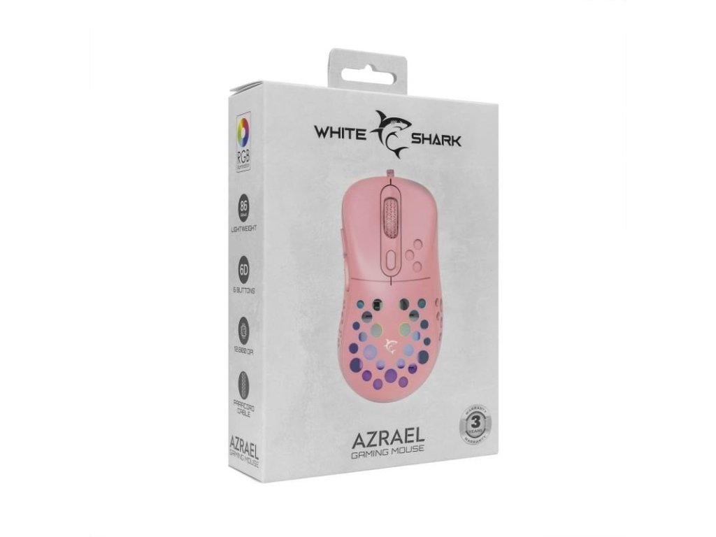 White Shark herní myš AZRAEL - Prožijte úroveň přesnosti a stylu s touto lehkou herní myší. Uvolněte přesnost a styl s herní myší White Shark AZRAEL. Díky 6 tlačítkům napájeným čipovou sadou Instant 825 nabízí životnost 10 milionů lisů s přepínači HUANO. Optický senzor 7200 DPI, zrychlení 20G ??a frekvence dotazování 1000Hz zajišťují rychlé a přesné pohyby. S elegantním matným povrchem, opleteným kabelem a hmotností 86 g je AZRAEL směsí výkonu a estetiky. White Shark herní myš AZRAEL je vaším dokonalým herním společníkem. Pouze 86 gramů 6D - 6 tlačítek 12 800 DPI (přes software) SPECIFIKACE Typ: 6D - 6 tlačítek Čipová sada: Instant 825 Životnost: 10 M lis - HUANO Zrychlení: 20G Software: Ano Barva: Růžová Povrchová úprava: Matná Pletený kabel: Ano Typ snímače: Optický Rozlišení (DPI): 7200 (12800 SW) Polling rate (Hz): 1000 Osvětlení: RGB 16,8 M barev Spodní vycpávky: UPE Materiál: Plast Rozhraní: USB 2.0 Kompatibilita myši: Windows 7/8/10/11/MacOS ROZMĚRY A HMOTNOST Rozměry (mm): 123x64x43 Hmotnost (g): 86Dodatočné parametre