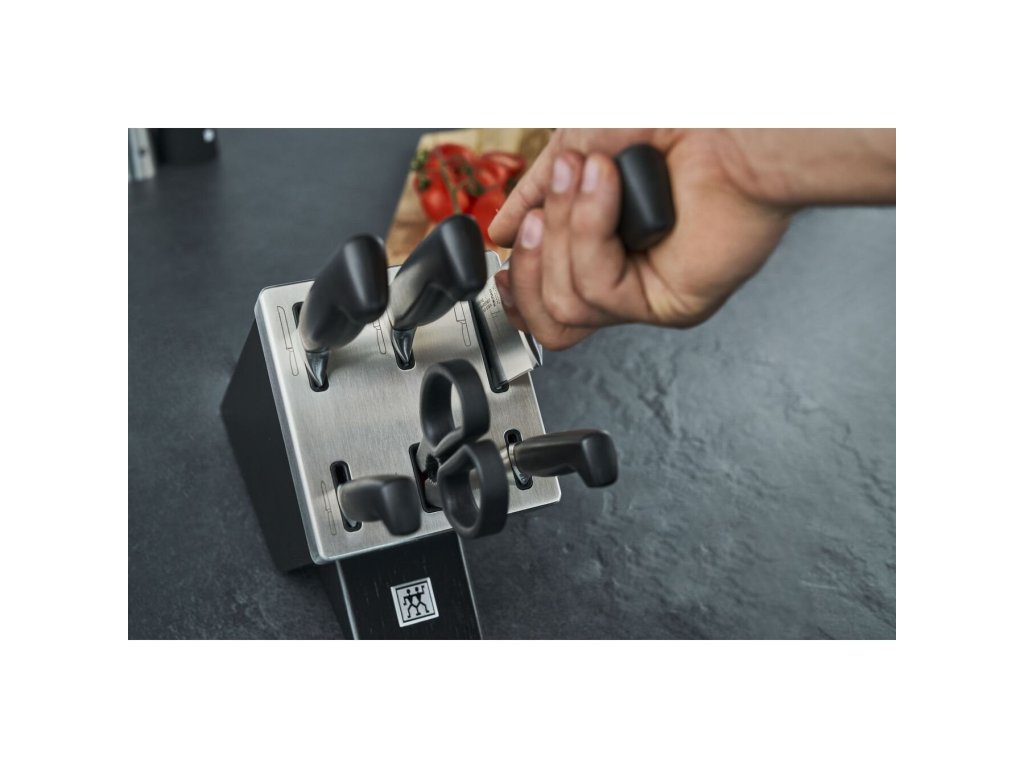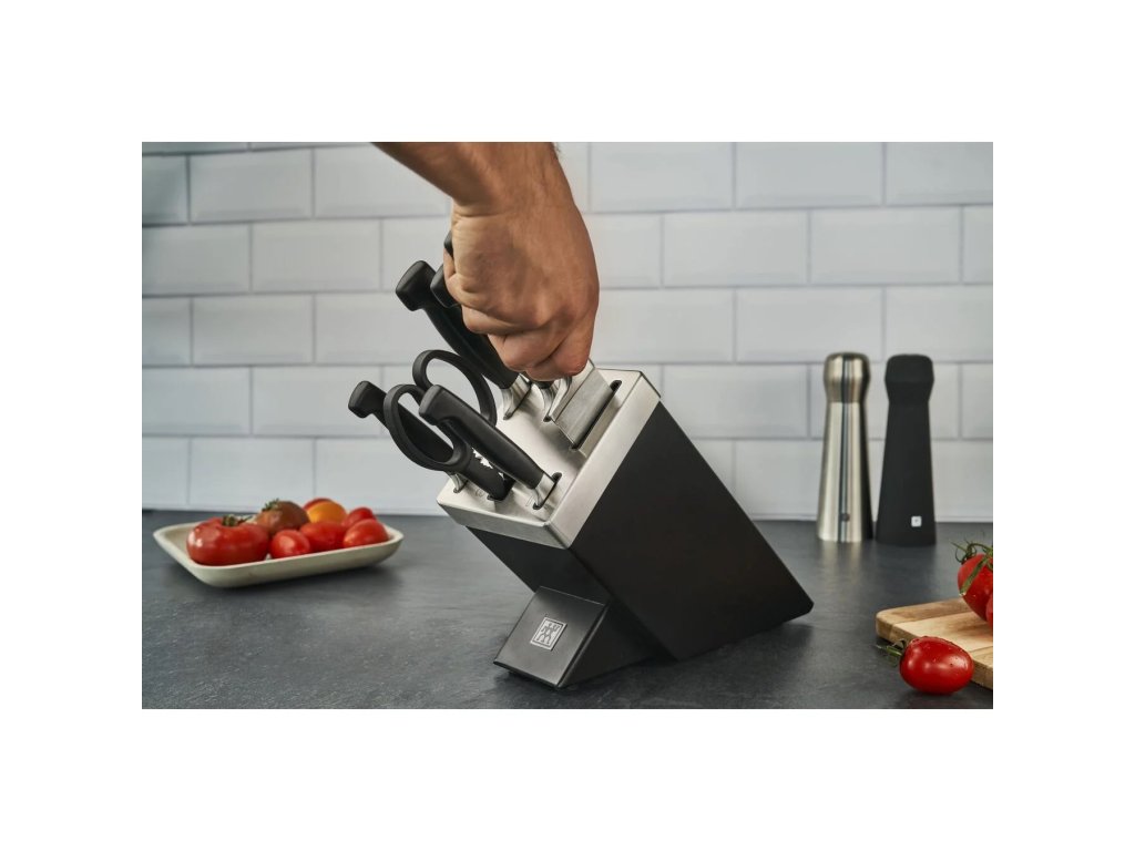 Ostré nože sú bezpečné nože: ich použitie si vyžaduje menej sily a nešmýkajú sa. A v budúcnosti sa o optimálnu ostrosť vašich nožov postará ZWILLING SharpBlock s technológiou KIS zo série VIER STAR®. Samoostriaci blok na nože chráni vaše nože pred poškodením a robí všetku prácu za vás, aby ste ich naostrili ručne. Nemusíte sa teda starať o to, kedy je správny čas na nabrúsenie nožov a ako ich správne naostriť. Tajomstvo bloku sa skrýva vo vnútri: do priehradiek na nože s hladkým povrchom boli integrované dva keramické brúsiče, ktoré sú usporiadané pod ideálnym uhlom na ostrenie. hranami (nože na krájanie a zdobenie, nože na mäso a kuchárske nože). Pri každom vytiahnutí alebo zasunutí noža sa čepeľ automaticky narovná a nože sú vždy ostré a pripravené na použitie - bez námahy. Pre optimálnu prehľadnosť jednoduché piktogramy ukazujú, ktorá priehradka je vhodná pre ktorý tvar noža. Blok na nože zabezpečuje nielen dlhú životnosť vašich nožov, ale je aj vizuálnou ozdobou vašej kuchyne. Blok v elegantnej čiernej farbe sa hodí do každej kuchyne a je vybavený krytom z nehrdzavejúcej ocele pre väčšiu odolnosť. Obsahuje 1 nôž na krájanie a zdobenie (10 cm), 1 úžitkový nôž (13 cm), 1 nôž na mäso (20 cm), 1 kuchársky nôž (20 cm), 1 nôž na chlieb (20 cm), 1 viacúčelové nožnice, 1 blokDodatočné parametre